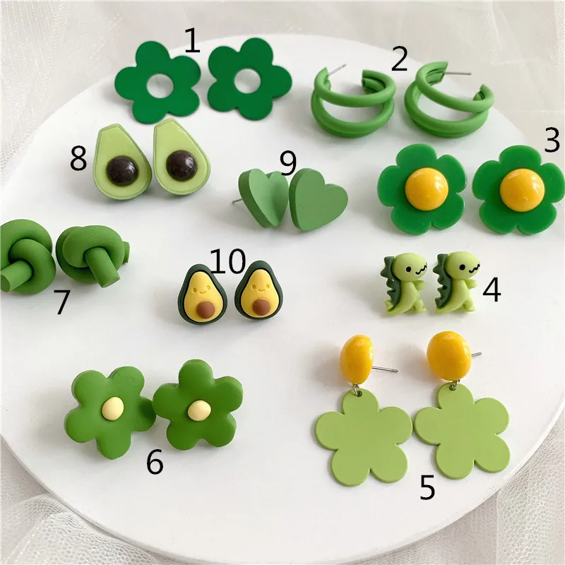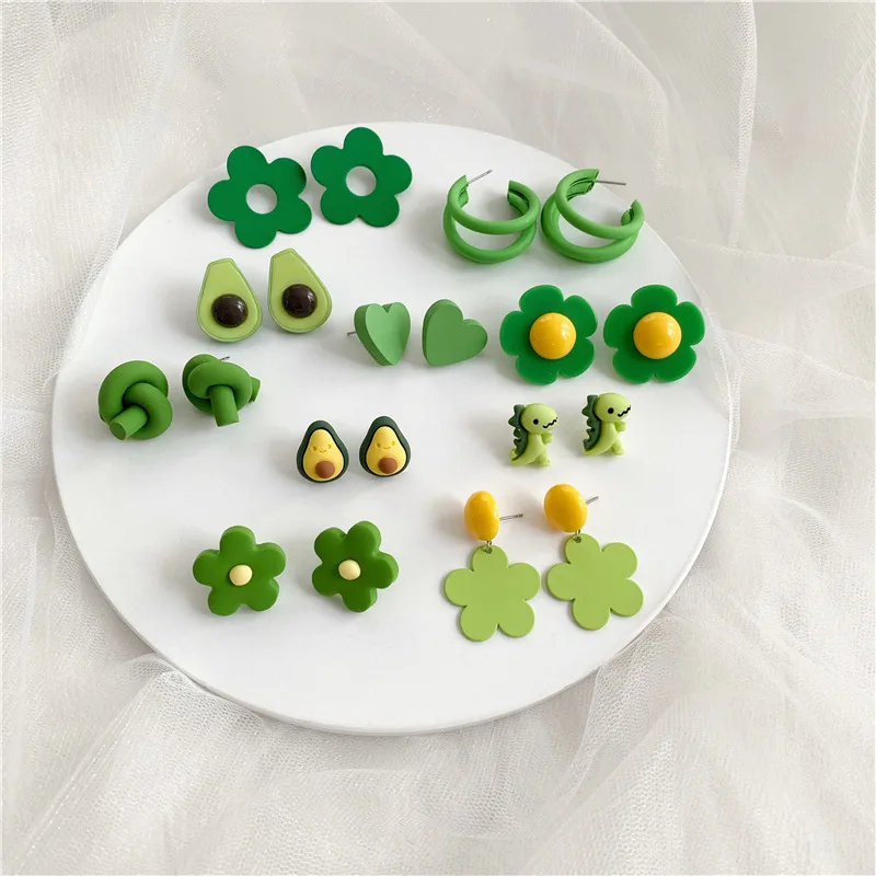 10pair/set Avocado Earrings Flowers Vintage Stud Earrings Green Love Earrings Female Cold Breeze Pa
